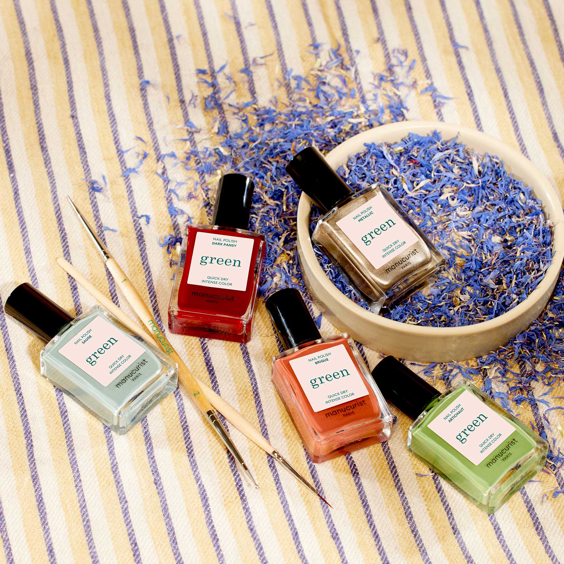 Les quatre teintes sont disponibles en Green Flash (19€) et en Green (14€) ainsi que les paillettes (9€) sur le site de Manucurist à partir du 15 Septembre 2023.